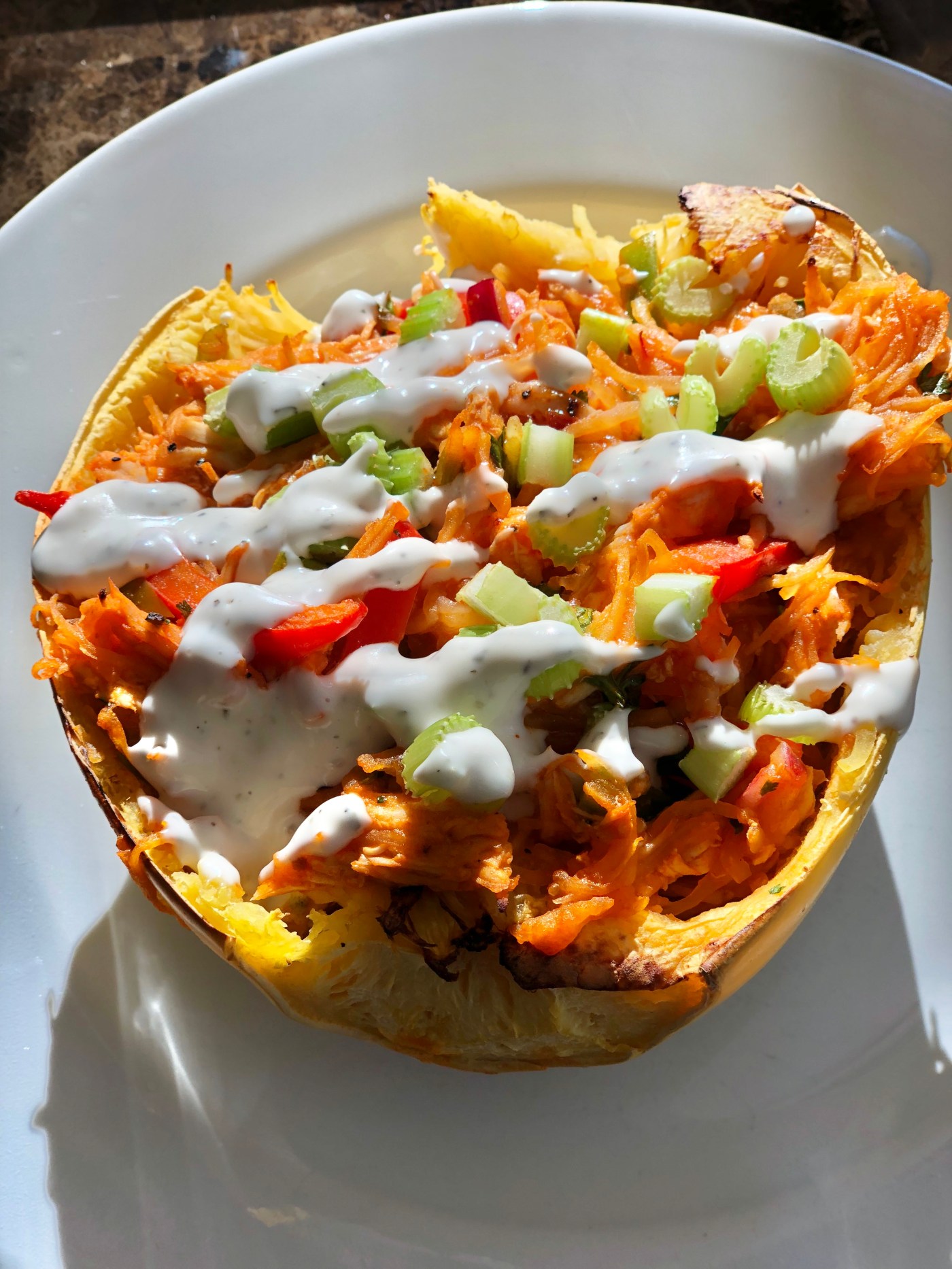 Stuffed Spaghetti Squash Buffalo Chicken Style