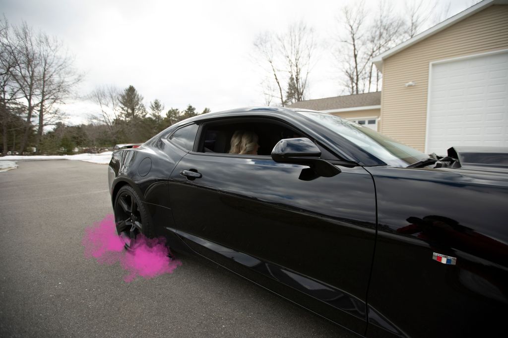 We had them take the envelope with the gender in it inside our garage, and had them get all of the supplies set up. Jeff and I hopped in the car and anxiously waited for everything to be set! We made sure the GoPro was set too and we were ready! At that very moment I was so excited that we waited to find out until then. It was all so special. The tires were set, and Jeff was ready to burn some smoke and rubber LOL! The engine started roaring and I couldn’t see the smoke right away. I was actually silently thinking, “Oh gosh I hope this works…” And just a few seconds later, HOT PINK SMOKE!! It started rolling out and I was in shock!! I really thought it was a baby boy at that point and was ready to see blue smoke come out! Instant tears came, and my heart was full of joy. IT’S A GIRL!!!!! The smoke actually blew inside the car and Jeff’s sweatshirt was covered in pink too! I couldn’t stop the tears at one point, and then I was worried my makeup would be all messed up for pictures after!