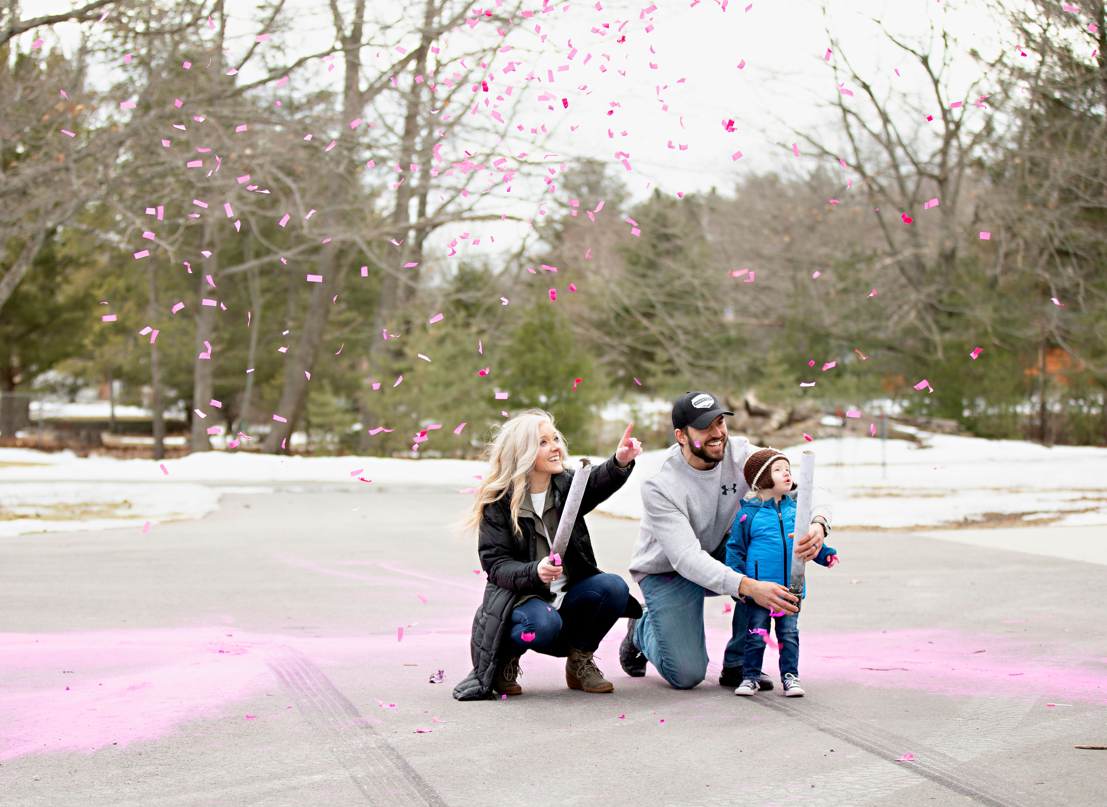 We were able to have a few family members there for the reveal and Carter of course too! He’s so excited to be a big brother, whether he knows it or not yet, LOL. He loves cars so I think he was most excited about the car revving the engine! He loved running through the pink powder too. His little Converse shoes were full of pink powder!