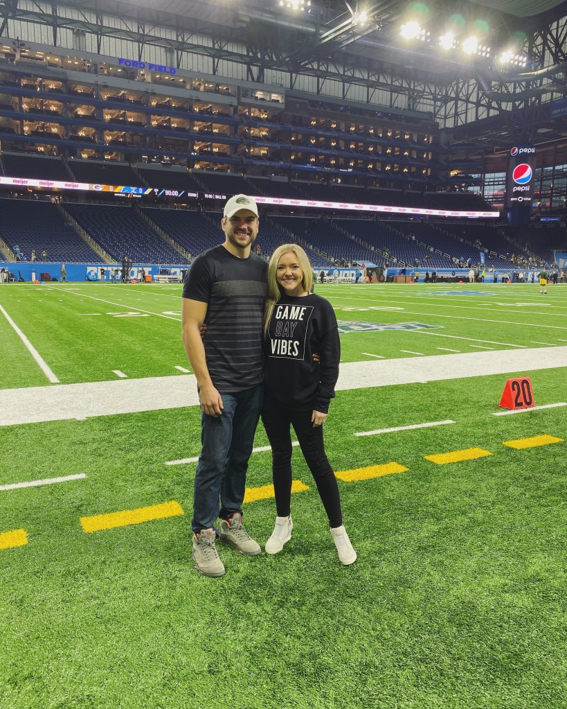We headed down to the Detroit area the night before the game and had a really nice night out with Megan and Collin. Jeff and I don’t find the time very often to get out to dinner just the two of us, and then every time we do we wonder why we don’t do it more often! It’s really great getting some “adult talk” in and not getting interrupted by our sweet Carter most likely asking for a snack LOL. Shout out to the grandparents for being such awesome babysitters while we were gone! We had dinner at a place called Bakersfield, and then went out after to watch the Ohio State game, since Collin is a huge Ohio sports fan. But we were more excited about the game on Sunday so we didn’t stay out too late!