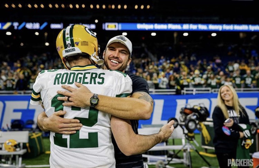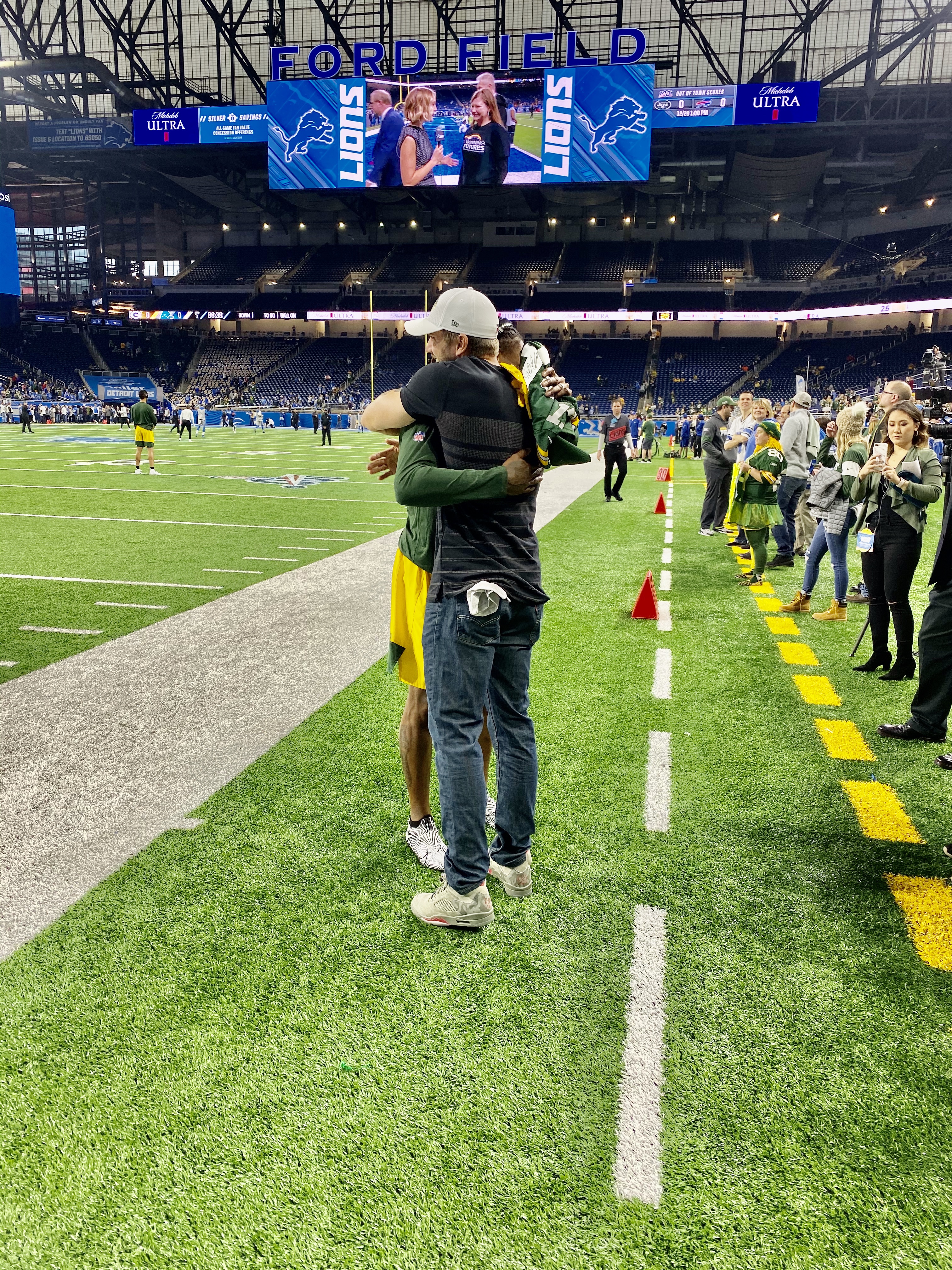 We actually got to see and catch up with way more players and coaches than I thought. Eventually we were catching up with one of the security guards for the Packers (he was always one of my favorites), and he led us over by the benches to catch up with some of the coaches. That was when Jeff ran into Aaron quick too.