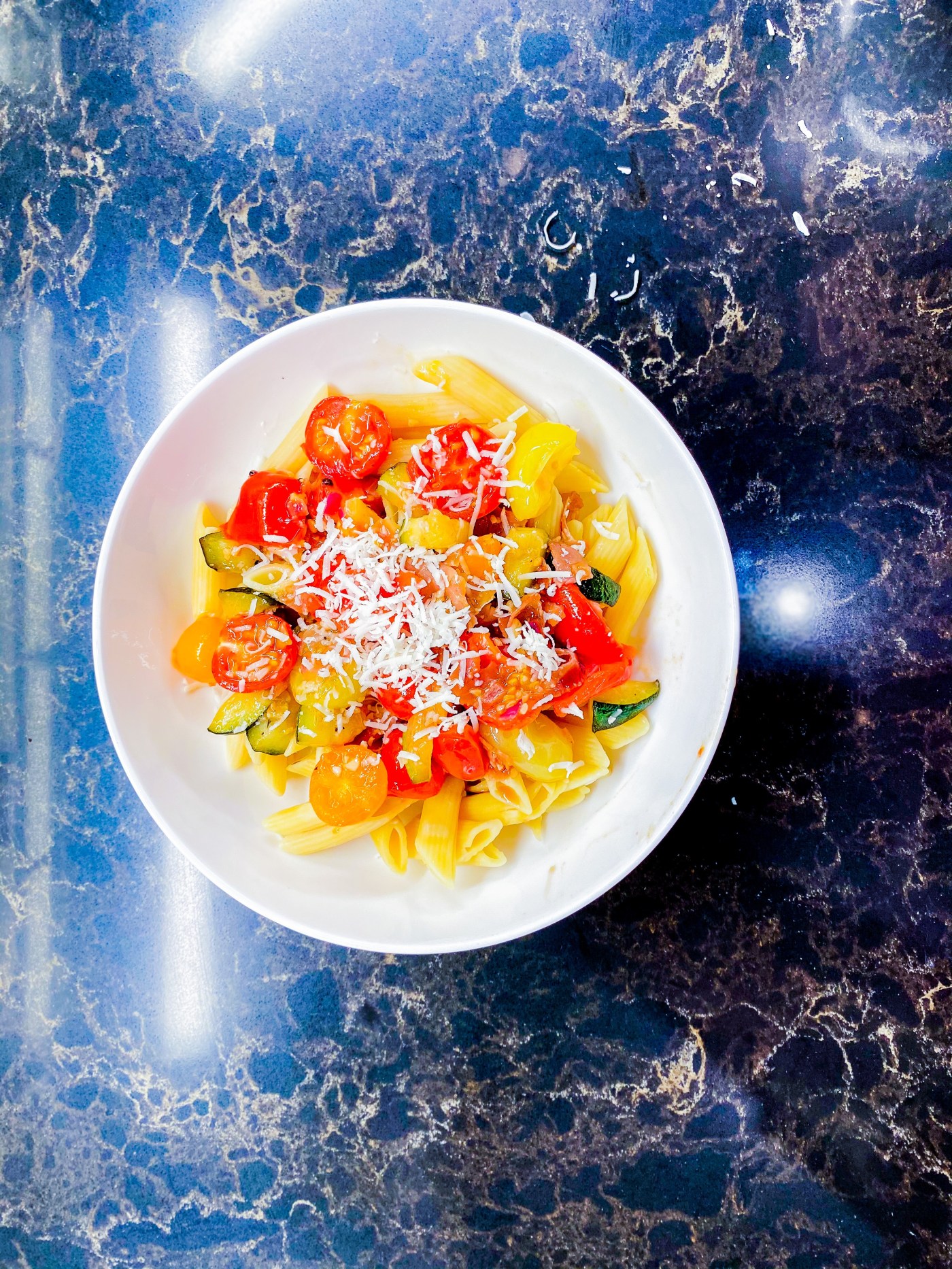I’ve been told to try that pasta brand “Banza” for a while, but I figured it’d taste bad like the other pasta alternatives I’ve tried! I ordered it in my grocery pick up to try and I actually really liked it. This recipe calls for lots of fresh veggies and a little chickpea pasta. I splashed a little Balsamic vinegar to top it off, but that’s optional. Jeff had three helpings, SCORE! We hope you love it too!